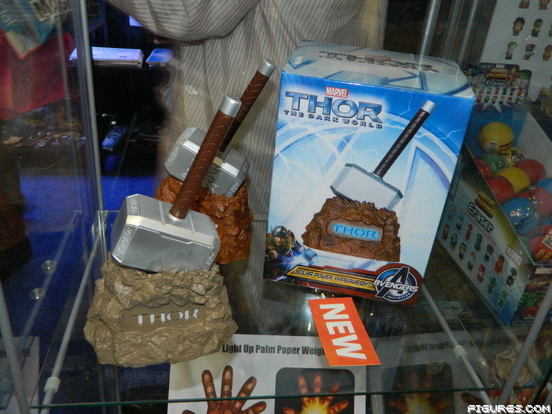 Monogram is well known for its great collection of fun collectibles, especially those capturing the iconic superheroes and villains of Marvel Comics. Your one stop shop for everything from keychains to hefty bust banks, Monogram has you covered. This year at Toy Fair they showed off plenty of cool new products on the way for 2013. A new line of light up paperweights bring the hardware of the Marvel comics universe to your desk, starting with Thor’s hammer Mjolnir from the upcoming sequel Thor The Dark World! This impressive item features a solar-powered base with light up Thor logo and removable hammer. Next up will be the Iron Man 3 Light Up Palm paperweight capturing the armored Avenger’s hand, also solar powered.