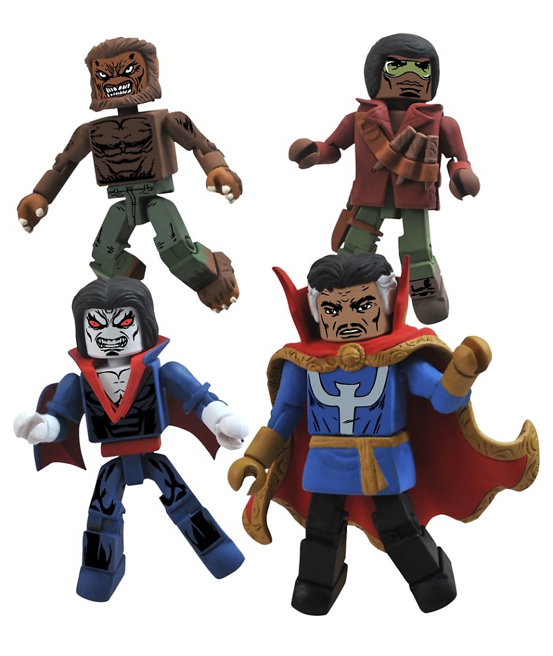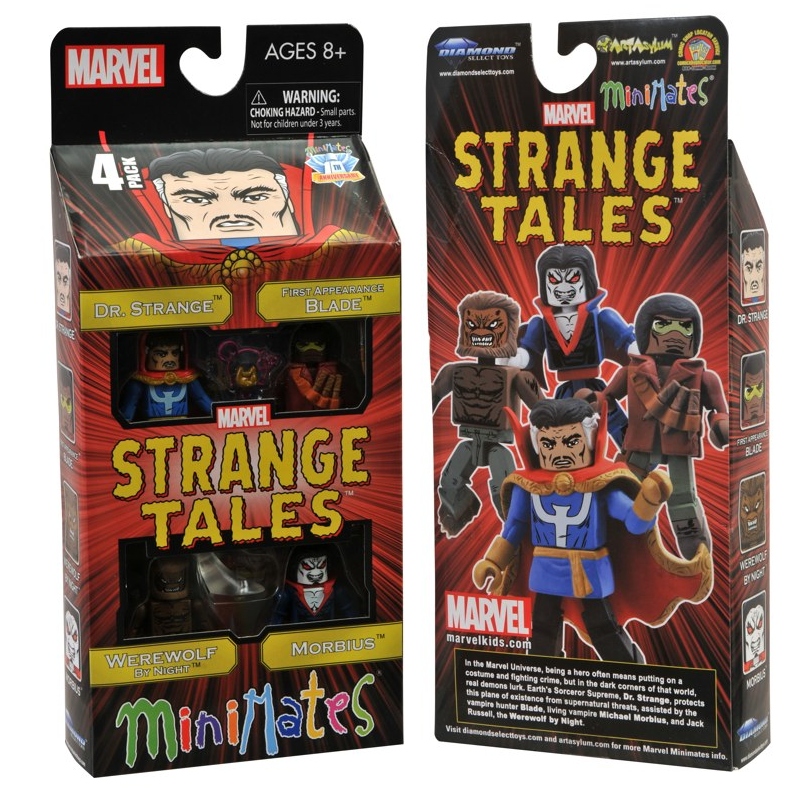 Sorcerer Dr. Strange takes the spotlight on the new packaging for DST's Strange Tales Minimates box set, featuring Strange, First Appearance Blade, Werewolf by Night and Morbius the Living Vampire.