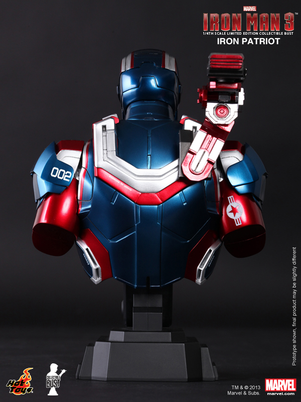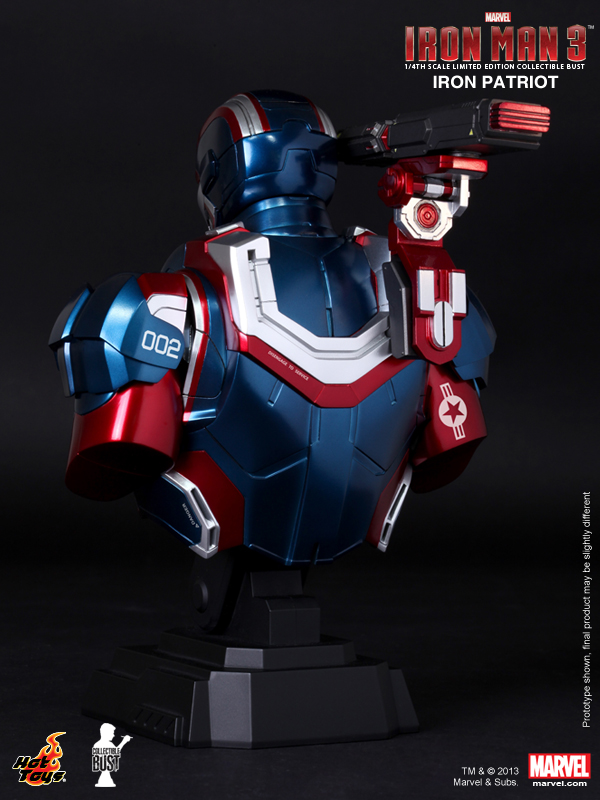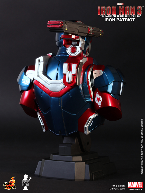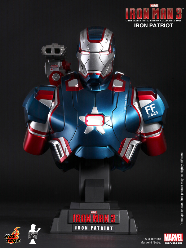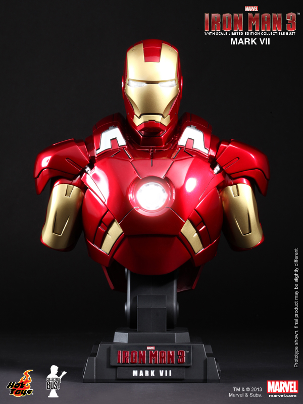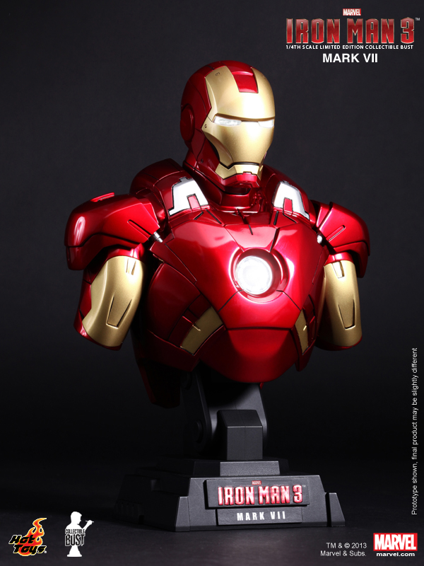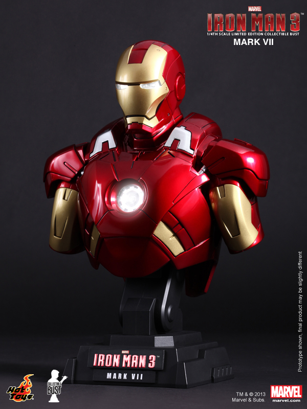 Hot Toys presents two new additions to their Iron Man 3 Collectible Bust collection. Joining Iron Man Mark XLII and War Machine (see our story HERE) comes Iron Patriot and Iron Man Mark VII. Approximately 1/4 scale, each bust measures around 9 inches tall and features LED-lighted eyes and hearts (white light, battery operated). Look for these to release in the third quarter of 2013.