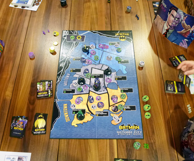 Starting up a Gotham City game is quick and straightforward, and though the game definitely takes time to master it’s easy to learn. You’ll need 2-4 players, each of whom choose a Villain to play; once those are chosen players get their character-appropriate figure, screen/hideout enclosure, Ability cards, and starting resources (Money, Information, and Threat tokens). In line with the trend of fun ways to choose the first player, Gotham selects the one with the most parking/speeding tickets, with ties going to the one who got the most recent! Starting Threats are placed on the map, Plot cards are dealt, Batman hides out in the Batcave, and you’re ready to begin!