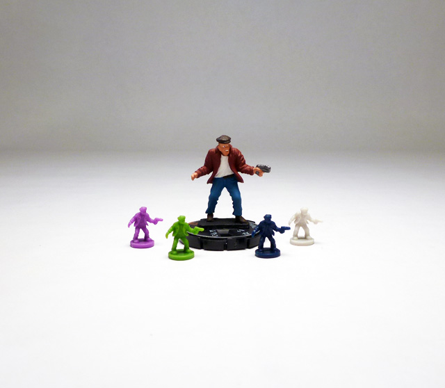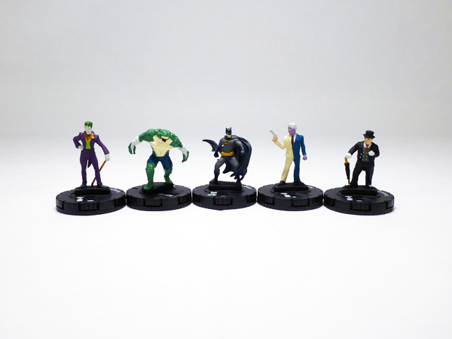 WizKids has been making great comic book miniature figures for years, so it’s no surprise that the five included here are very well done. Each one captures the essence of the character with a classically-inspired look and appropriate details. Joker wears his gaudy purple and orange suit while leaning on his cane, Penguin looks dapper with his monocle, double-breasted vest, and umbrella, while Two-Face matches order and chaos with two different looks, a gruesome half face, pistol, and coin in hand. My favorites are probably Killer Croc with great reptilian texture and a highly aggressive pose and of course Batman with his dynamic stance and swirling cape. All of the figures are intricately painted with lots of fine detail from Batman’s black and yellow Bat symbol to Joker’s squirting flower, the tiny yellow buttons on Penguin’s vest, and more. Each figure is mounted on a “clix” base that you turn each time you gain a level; the dial window shows you whether or not you gain an ability and what you need for the next level (Batman’s dial just displays his fighting and Threat-removing power). Whether you put them back in the box between games or display them on your shelf or desk, these are great looking figures that you’ll enjoy even when you’re not playing...