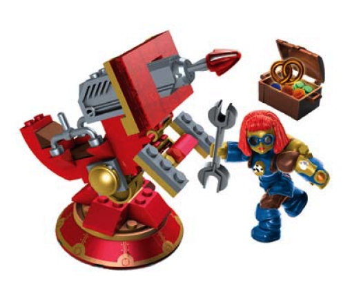 Buildable Sprocket Turret with working launcher, and 360 degree rotation. Includes Sprocket with wrench. Comes complete with treasure chest and pretzel loot! Approx 75 pieces.