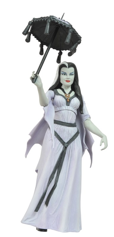 Born Lily Dracula of Transylvania, the matriarch of the Munster family is the daughter of a vampire, but werewolf blood also runs in her family, as both her brother and her son bear the curse. Loving dust and decay, she keeps the Munster household nice and messy, and is also an adoptive mother and confidante to her niece Marilyn. This 7-inch scale figure depicts actress Yvonne DeCarlo as she appeared in the 1965 TV episode “Hot Rod Herman,” complete with parasol. The Select version of Lily includes parts to build the family staircase diorama; the basic figure will also be available at Toys “R” Us.