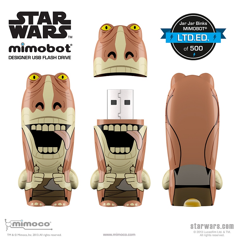 Mimoco, in collaboration with Lucasfilm, and to celebrate April Fool’s Day, announces the actual release of Jar Jar Binks MIMOBOT USB flash drives. After an upset about the prank release of the character last year, Mimoco has nodded to fans of Jar Jar by making the MIMOBOT an extremely limited reality; only 500 hand-numbered units are now available with up to 128GB of data storage.