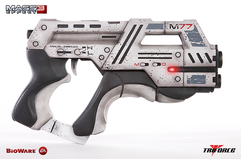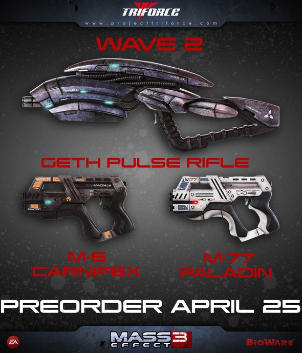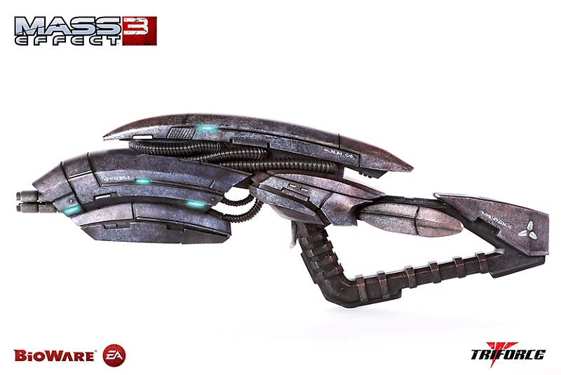 As reported last week (HERE), TriForce had teased their second wave of 1:1 scale Mass Effect 3 weapon replicas. It appears our guess was right on the money as TriForce reveals that fans will be receiving a Geth Pulse Rifle ($750, LE 500), M-6 Carnifex ($400, LE 500) and M-77 Paladin Pistol ($400, LE 200). Each replica is intricately crafted and cast in polystone and features working LED effects. Pre-orders for these replicas opened today at projecttriforce.com with shipping estimated 3rd Quarter 2013.