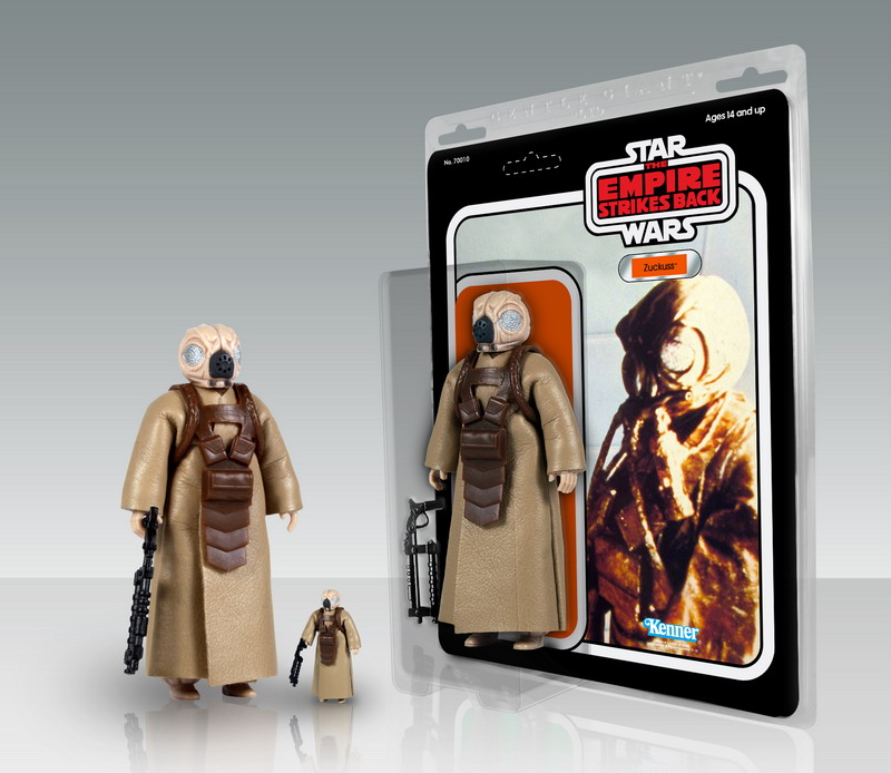 Zuckuss comes packaged on a 1980 Empire Strikes Back-inspired blister card, featuring original front and “45 back” artwork, in a re-sealable plastic outer clam shell to help protect and display. Look for him first quarter 2014 priced at $80.
