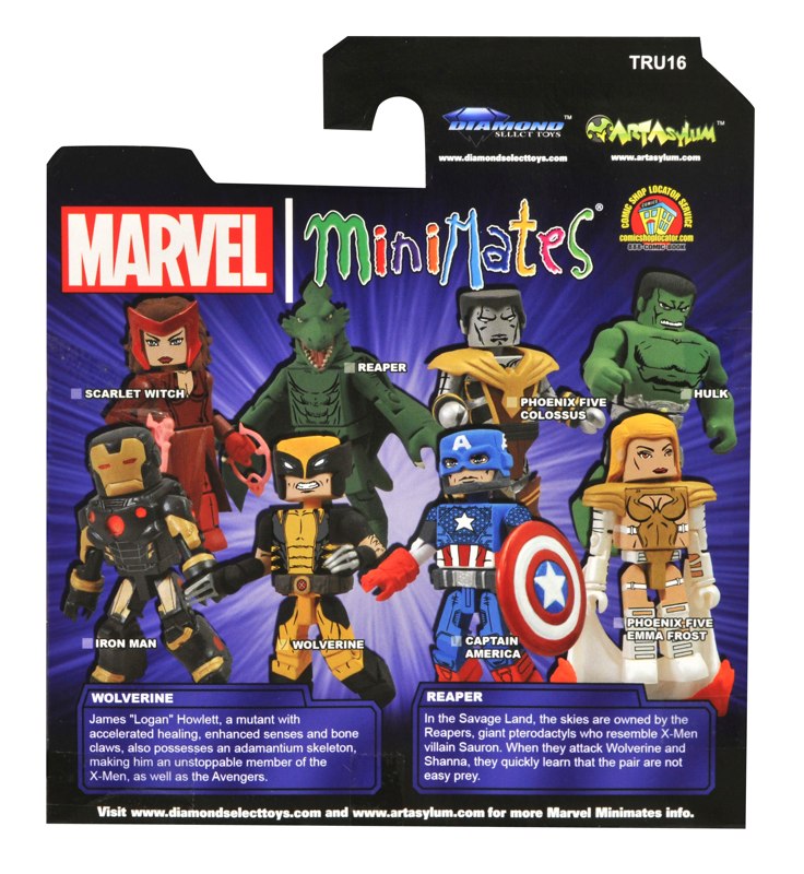 Next month, Diamond Select will pick some of their favorite characters from the Marvel Now initiative and give them all-new, all-Now figures for Marvel Minimates Series 17 at Toys"R"Us. The line-up includes The Avengers‘ Hulk and Iron Man, Uncanny Avengers‘ Captain America and the Scarlet Witch, and Savage Wolverine‘s Wolverine and a Savage Land Reaper, as well as a fourth two-pack with Phoenix Five versions of Emma Frost and Colossus from Avengers vs. X-Men, to add to your AvX-themed collection. Check out the new packaging below, and keep checking Toys"R"Us stores and toysrus.com for them to arrive next month.