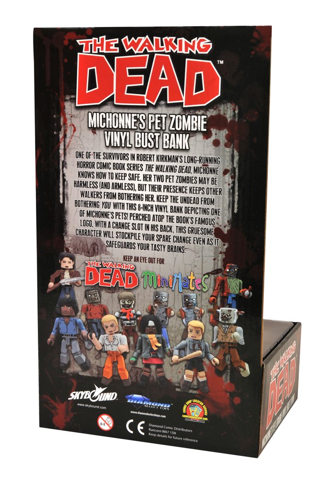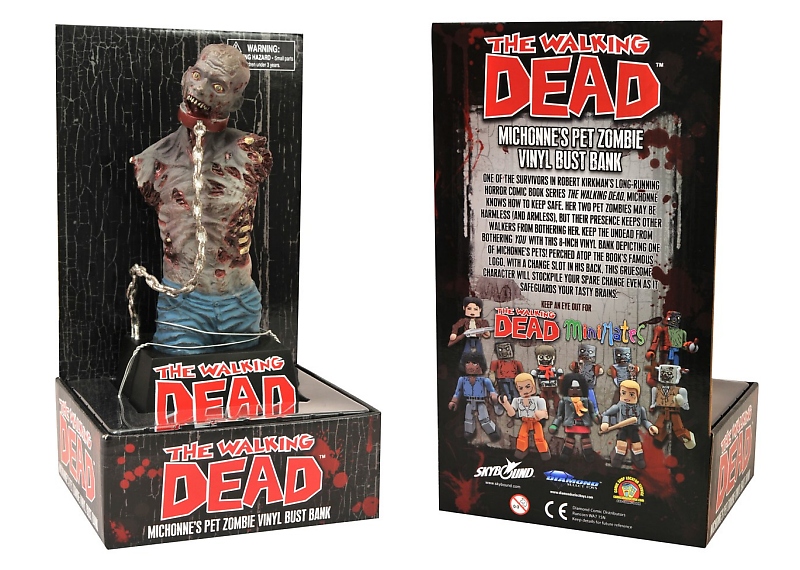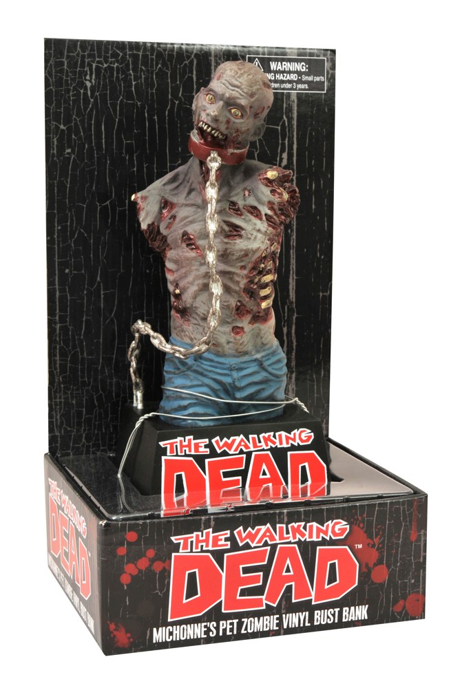 Sculpted by Eli Livingston, Michonne’s pet zombie Mike (or is it Terry?) has a collar and chain, but no arms or jaw, and is posed atop a black base with the Walking Dead logo. Place coins through a slot in the back, and remove them through a door in the base... or just leave him in his cool display tray (available at Toys"R"Us). Pick him up at TRU – or look for him roaming free in comic shops and specialty stores – this summer.