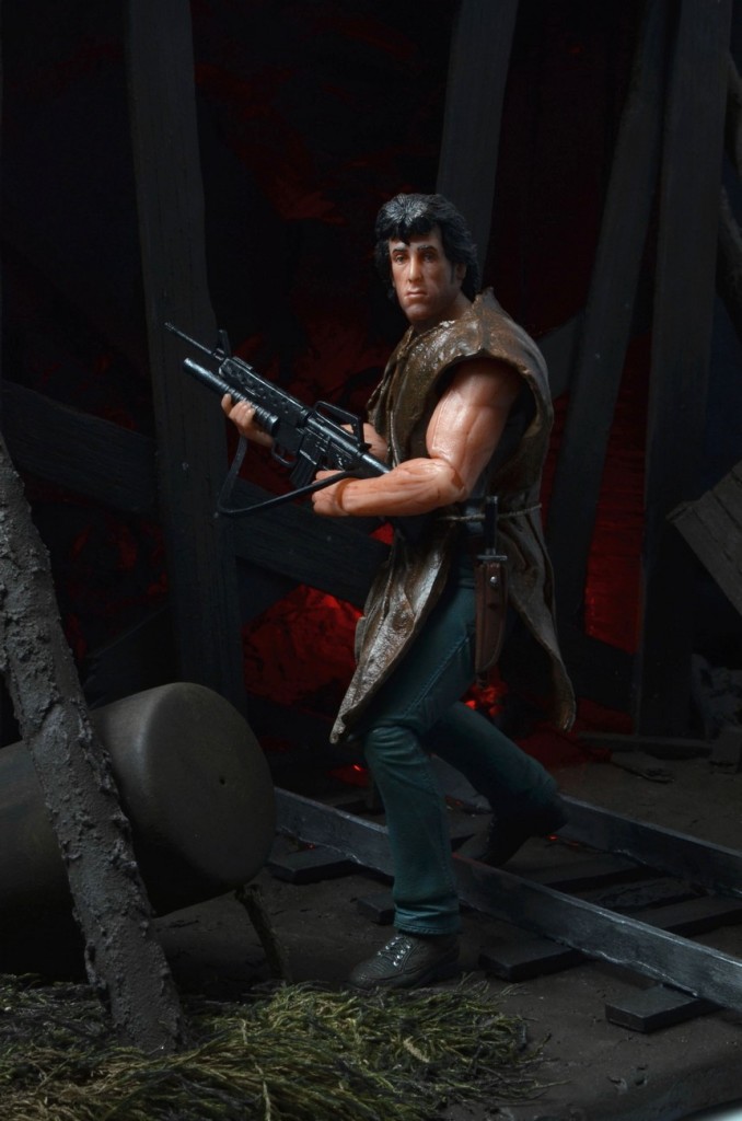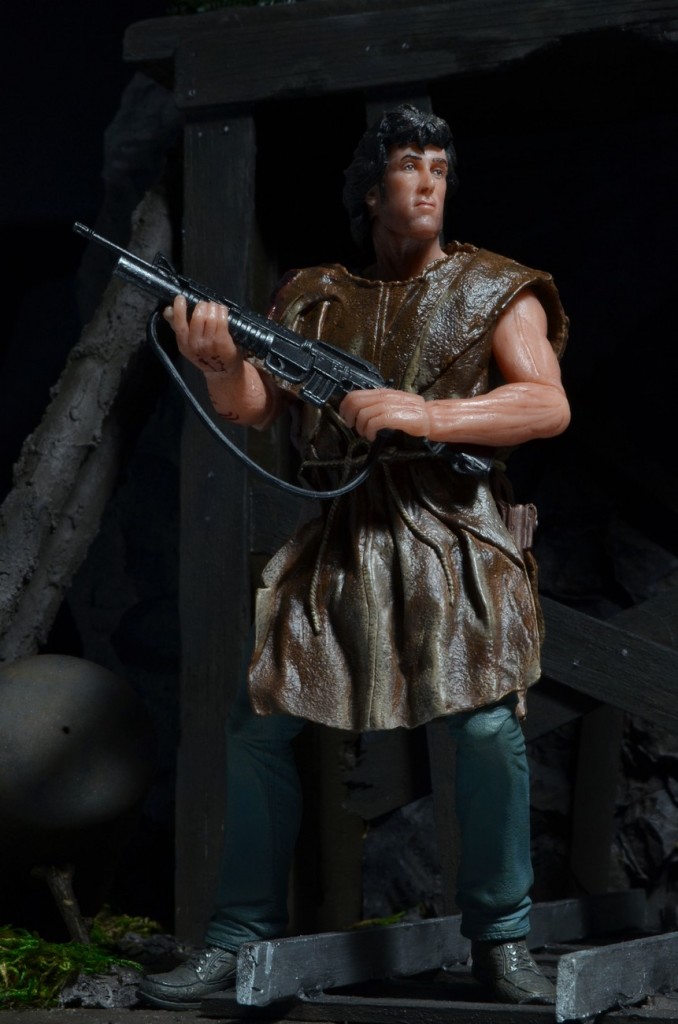Following the release of "First Blood" Rambo (hitting retail now), comes NECA's second 7-inch action figure of Sylvester Stallone: "Survival" Rambo. Pulled from the movie First Blood, this figure is based on one of the key action sequences where Rambo seeks shelter in the wilderness while being pursued by local police. Rambo comes loaded with tons of accessories including survival knife, walkie talkie, pistol, assault rifle, and spear.