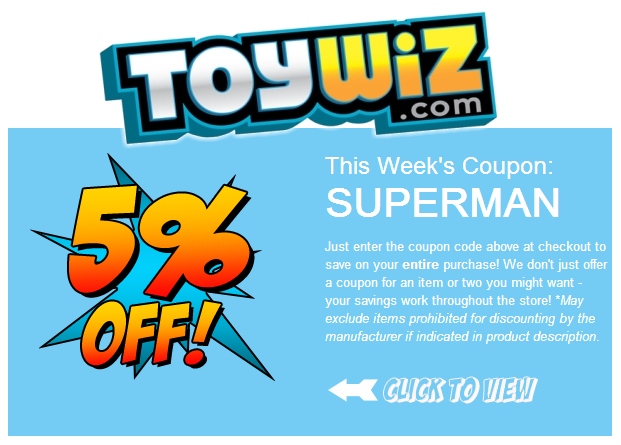 ToyWiz.com has thousands of in-stock items. Use the coupon code SUPERMAN and receive 5% off your purchase! Shop from an incredible selection of the newest and most popular action figures, toys, and collectibles including: