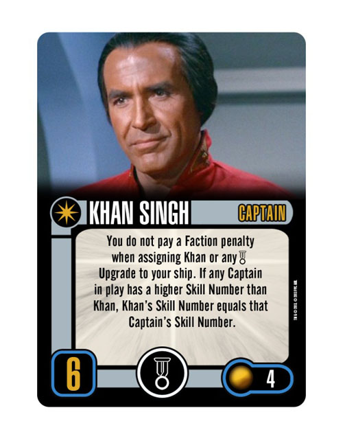 WizKids Games announces that they will release their new Star Trek: Attack Wing miniatures game at the GenCon gaming convention in Indianapolis, IN (August 15—18). To commemorate the release of Star Trek: Attack Wing, WizKids Games will offer attendees a limited promotional Captain Card of Khan Singh. This card and its corresponding game tokens will allow players to assign Khan Singh as the captain of one of their Star Trek: Attack Wing ships. This “Khan Exclusive” will be included with the purchase of Star Trek: Attack Wing products at the WizKids Games booth and will also be available as part of the prize package for players who participate in Star Trek: Attack Wing mini-tournaments being run throughout the convention.