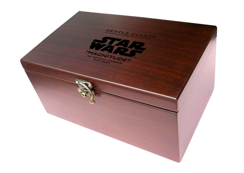 "Magnitude" an Admiral Ackbar mini bust, is based on the artwork by Steven Daily. This mini bust stands at 8" tall and comes in a screen printed wooden box with a 4 x 6 limited edition lithograph print by Acme Archives. Limited edition of 500 pieces. Each comes with a hand-numbered certificate of authenticity and bottom stamp.