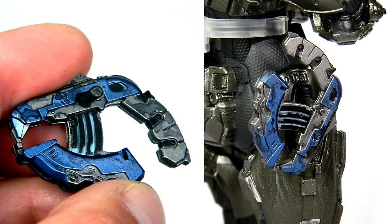Where the Spartan action figures from HALO: Reach featured a more down-and-dirty, drab military look, HALO 4 Play Arts Kai shines with a polished, high-tech futuristic aesthetic. This is immediately evident on their armor, the HALO 4 Spartans sporting an almost metallic sheen. I'm a fan of both looks, but I must say that the HALO 4 figures really pop on display with their high gloss paint jobs. The Spartan Warrior screams this the most with his blue and silver color scheme. You almost have to do a double take to assure yourself this figure isn't made of die-cast metal. Cool metallic paint applications aside, it's Square Enix's deftly applied micro insignia that truly elevate these figures to a new level of realism. Spartan military logos adorn strategic locations on each figure, from their chest plates and vambraces, to their ankles, knees and thighs. Sarah Palmer's emblems strike me as the most attractive here, the use of vibrant orange logos contrasting nicely with her gunmetal steel armor.