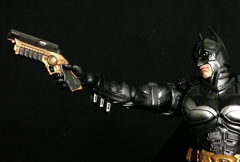 Figures.com reporter Jorge Pelaez has been given a early look at Square Enix's San Diego Comic-Con 2013 exclusive: a Play Arts Kai Batman, re-imagined in a metallic black finish. This 10-inch tall exclusive figure, based on Batman's look in The Dark Knight Rises, is priced at $64.99 and limited to only 1000 pieces created. The figure comes with alternate sets of hands, various weapons, and a display stand.