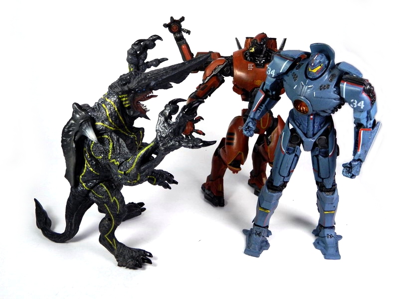 NECA is known for making many popular movie and video game character figures, but robots don't rank high on that list. In fact I can only think of a few: The Terminator and Robocop (technically both cyborgs), the upcoming ED-209 and Marvin from the disappointing Hitchhiker's Guide to the Galaxy (stick with the books, kids). Seeing NECA work in the same figure field as "mecha masters" Bandai and Kotobukiya is both exciting... and a little daunting. Do they have the chops to pull off a cool robot collectible? As a passionate robot collector, I'm happy to report that's a big YES. For an $18.99 toy, the Pacific Rim figures hold their own against many Japanese mecha of similar size and construction, most which sell for twice that amount. Each Pacific Rim figure is made of some very dense and durable plastic, but are elevated in awesomeness by NECA's renown detailed sculpting and generous points of articulation. Let's take a closer look at each figure...