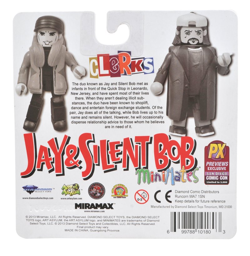 The first exclusive two-pack includes Jay and Silent Bob in black-and-white, just as they appeared in Smith's groundbreaking debut film, Clerks. Future sets will be in black and white as well as full-color, and will be based on all of the View Askew universe films: Clerks, Mallrats, Chasing Amy, Clerks 2 and Jay and Silent Bob Strike Back. Each Minimate mini-figure stands approximately 2 inches tall, with interchangeable parts and accessories.
