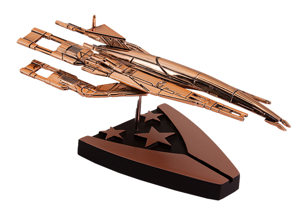 Dark Horse keeps the San Diego Comic-Con exclusive reveals coming with their sixth show offering. Presenting the Con exclusive Mass Effect: Bronze Normandy SR-1 Ship Replica. This bronze plated 6.75-inch long replica on base depicts Commander Shepard's starship in the first Mass Effect game (It was replaced by the SR-2 in Mass Effect 2). Packaged in full-color box, the Bronze Normandy SR-1 Ship Replica will be sold at booth #2615 priced at $50. Only 300 are being produced for the Comic-Con (limit of two per person all days of the show).