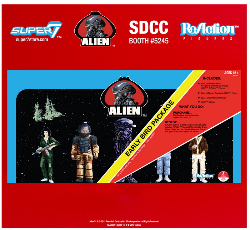* ALIEN ReAction "Early Bird Package" ($100): Includes all five figures (Big Chap, Ripley, Ash, Dallas and Kane in Space Suit) as well as an ALIEN figures display stage (including original artwork created in the style of 1970s packages), ALIEN Club Membership Card, ALIEN photos, and a sheet of ALIEN stickers.