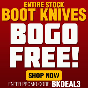 Pick up your favorite items during BudK's "Choose Your Deal" exclusive online sale! This offer ends tonight, so don't wait. ALL zombie gear gets Free Shipping. ALL knives are 20% Off. Shop our ENTIRE STOCK of boot knives BUY ONE GET ONE FREE, or take 15% Off of ALL tomahawks and axes!
