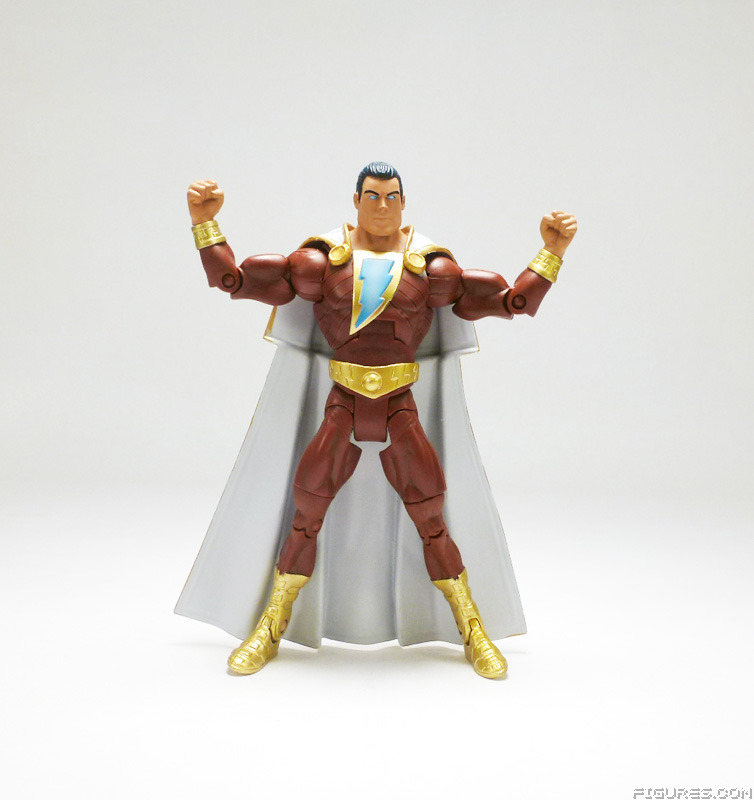 Just as with all of Mattel’s DC figures (whether they’re Universe Classics, Signature Collection, or the like), Shazam has excellent articulation and great poseability. With a standard body comes the standard scheme: ball-jointed neck, ball-jointed shoulders, biceps, elbows, wrists, ab crunch, waist (under the belt), double-jointed hips, rotating thighs, knees, and ankles! Of course, with a cape as big as Shazam’s there’s going to be some limited mobility in those joints, but the figure still looks good in several poses. For display options there’s also the removable hood. The figure comes packaged wearing the addition, and it’s a simple matter of sliding it off or putting back on. Frankly, I’m not a fan of the way it looks on the figure so I don’t plan on using it, but I suppose it’s nice to have and I’m sure some of you will prefer it to the bareheaded look.
