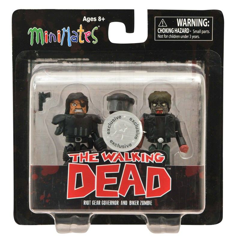 Based on the famous Prison vs. Woodbury storyline, the assortment includes new, exclusive figures of Rick Grimes, the leader of the main band of survivors, and the Governor, the sadistic ruler of Woodbury. Both depict the characters as they appear towards the end of the storyline, bearing the severe injuries inflicted upon them by the Governor and Michonne, respectively. Both figures are exclusive to Toys "R" Us, and each comes with his own exclusive walker, the Gunshot Zombie and the Biker Zombie, respectively.
