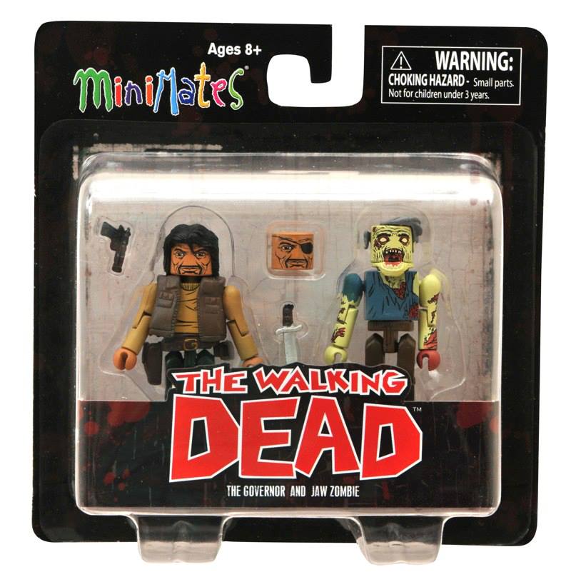 Also in the assortment are the sword-wielding Michonne (in her poncho) and a pre-conflict figure of the Governor, both of whom are also available in the specialty store assortment. However, the specialty-exclusive figures of Woodbury goons Gabe and Bruce have been replaced by two new zombies. Michonne comes with the Crawling Zombie, who has a lower body piece that allows him to drag his severed torso along the ground, and the Governor comes with the Jaw Zombie.