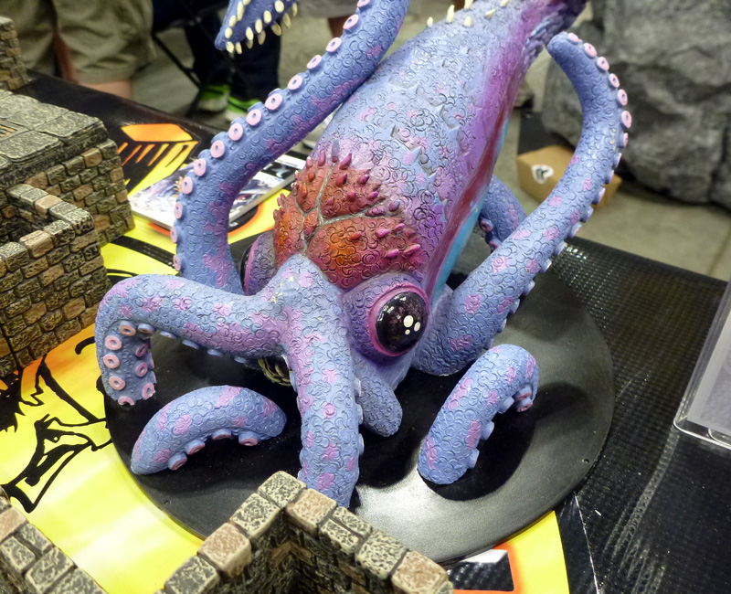 At Gen Con Dungeon Crawler showed off some of its first Kickstarter series including the massive Kraken and were selling plenty of figures and creatures both painted and unpainted. To tease their supporters there was even a display case with prototypes from the upcoming second Kickstarter project including a very cool and understated Treant, impressive Standing Stones with removeable pieces, and a series of different heads mounted on stakes!