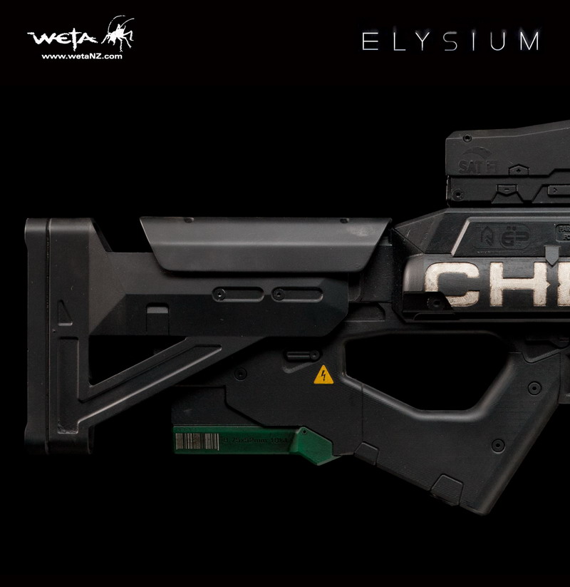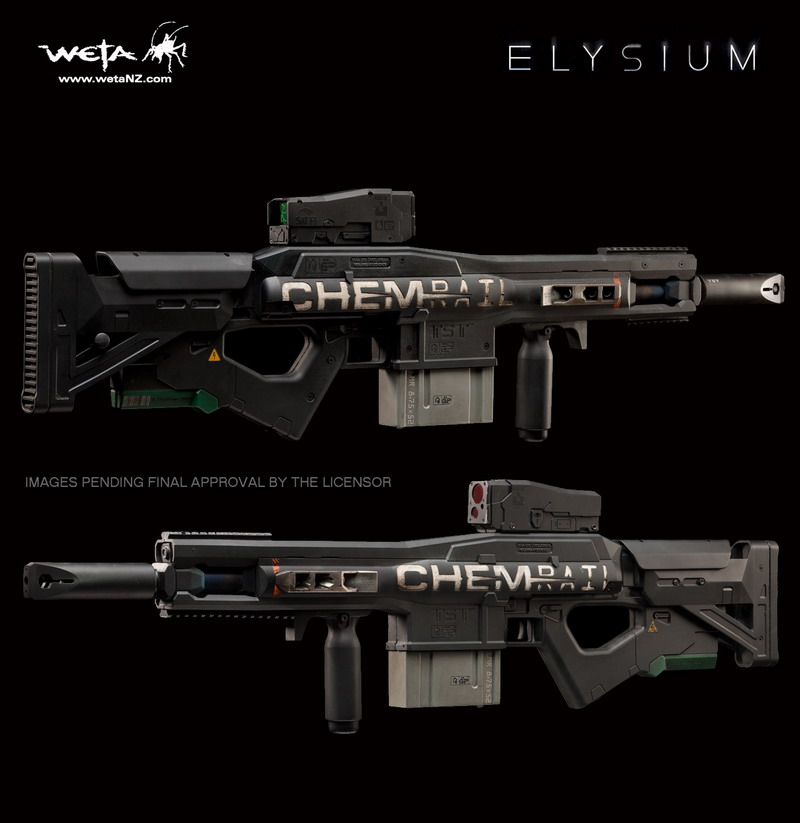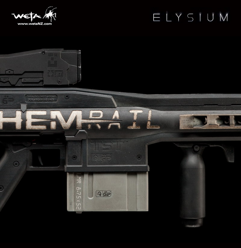 Speaking of Elysium weapons, Weta will also be releasing a prop replica of the TST Chemrail, an EXACT replica of the gun Max (Matt Damon) wields in Elysium. The gun is made from fibreglass, which gives it great heft, with some minor details made from other materials. The gun has no moveable parts and it comes with a wall mounting bracket for display. It measures 11.4" H x 40.2" W x 2.8" D. The TST Chemrail prop replica is scheduled to ship March - June 2014. Pre-orders are currently being accepted at wetanz.com, the replica priced at $399.