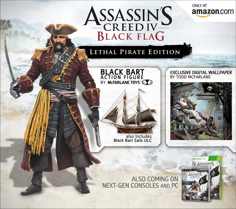 As if that wasn't enough, Amazon is also offering an Assassin’s Creed IV: Black Flag Lethal Pirate Pack (pictured below), combining the exclusive Black Bart action figure, a code to unlock Black Bart’s sails in-game, exclusive digital wallpaper created by artist Todd McFarlane, and a copy of the Assassin's Creed IV Black Flag video game with pre-order bonus unlockable game content: the Hidden Mystery Pack.