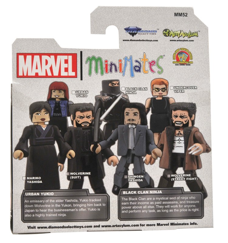 Diamond Select Toys shares with fans new packaged photos of their The Wolverine Minimates, hitting comic shops and specialty stores today, September 4th. The specialty assortment includes a few exclusive figures of the ladies of The Wolverine, including Mariko, Viper and Yukio in her funeral garb.
