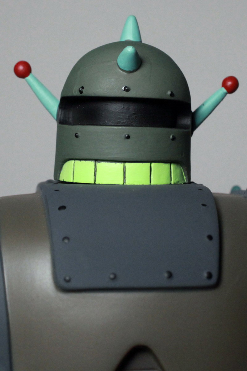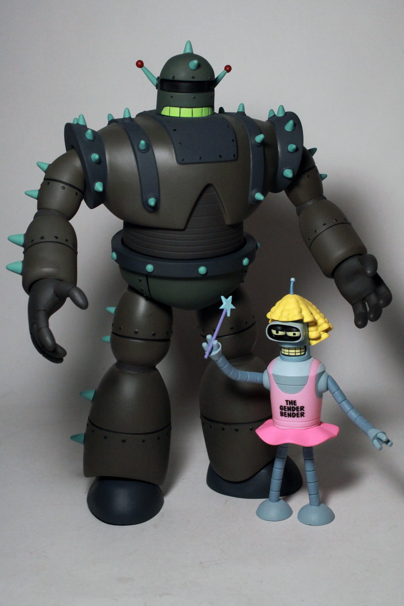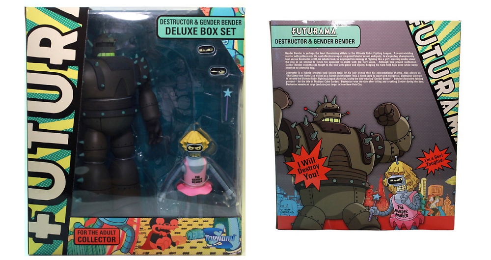 A San Diego Comic-Con exclusive from Toynami this year was a deluxe set featuring Destructor, our favorite bending unit, Bender as the Gender Bender. Destructor, also known as “The Gizmo from Pismo” faces the tut-wearing “Gender Bender for the Ultimate Robot Fighting League title at Madison Cube Garden.
