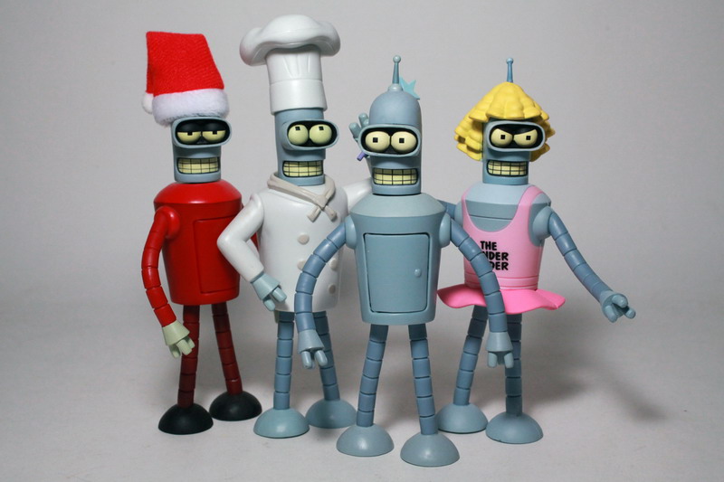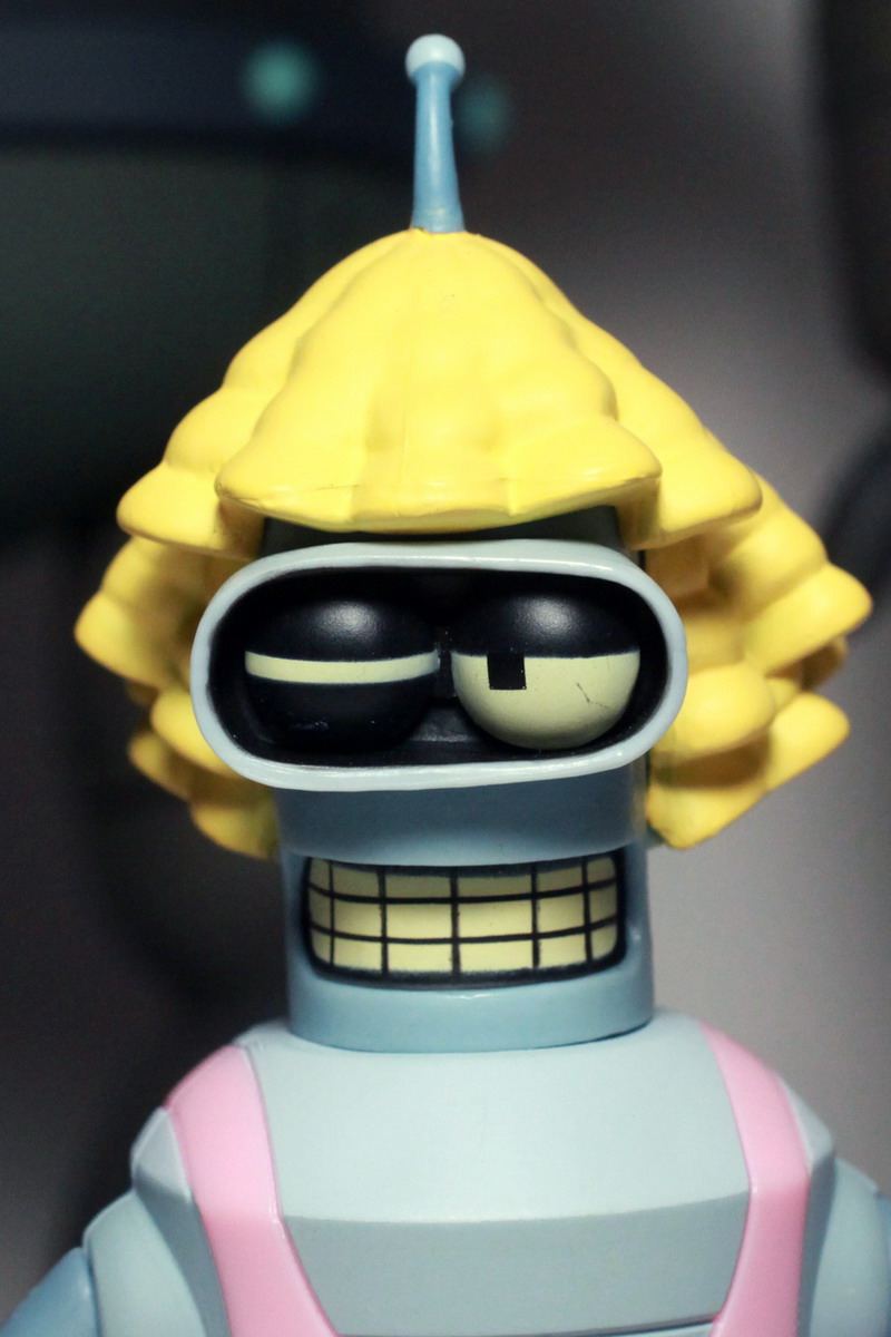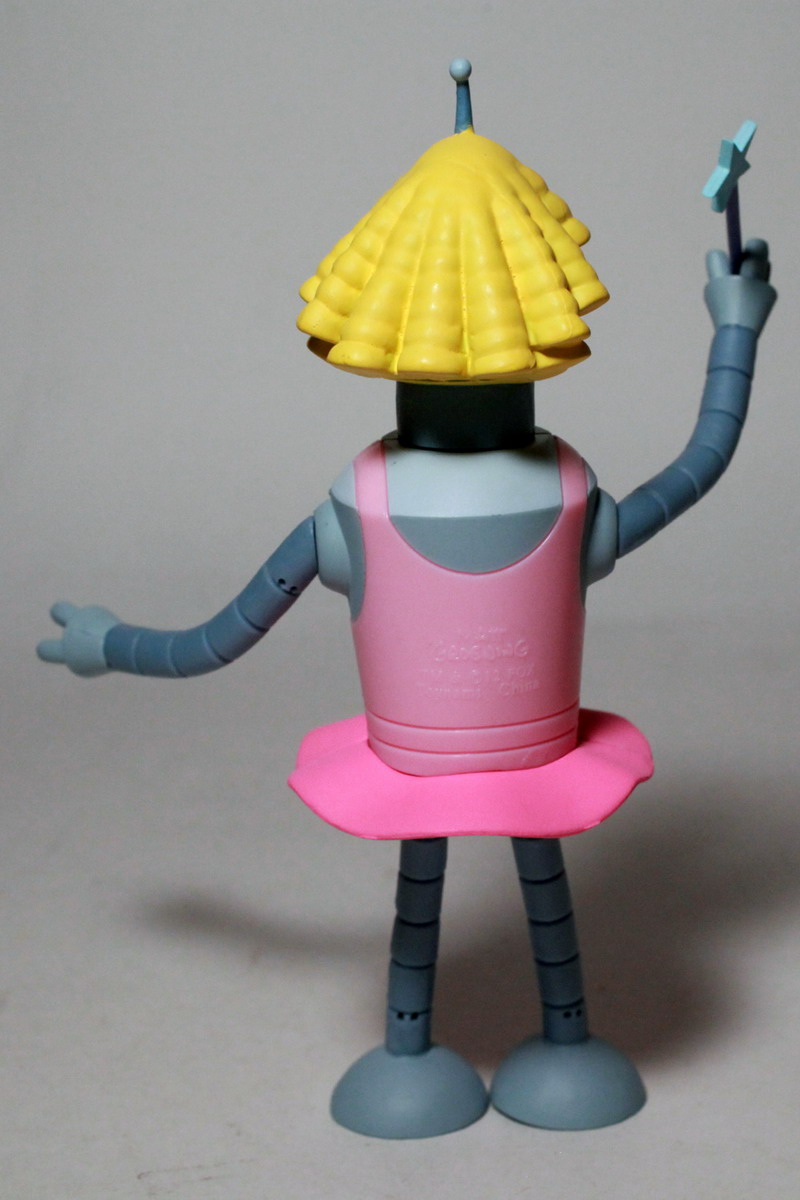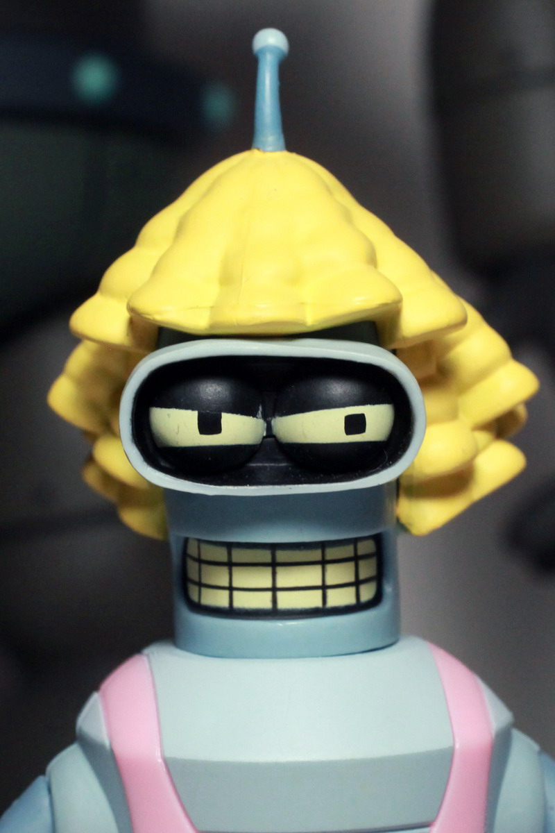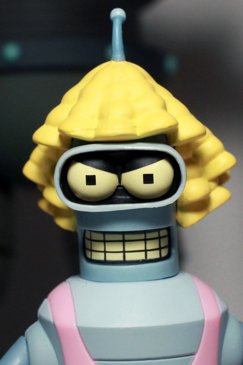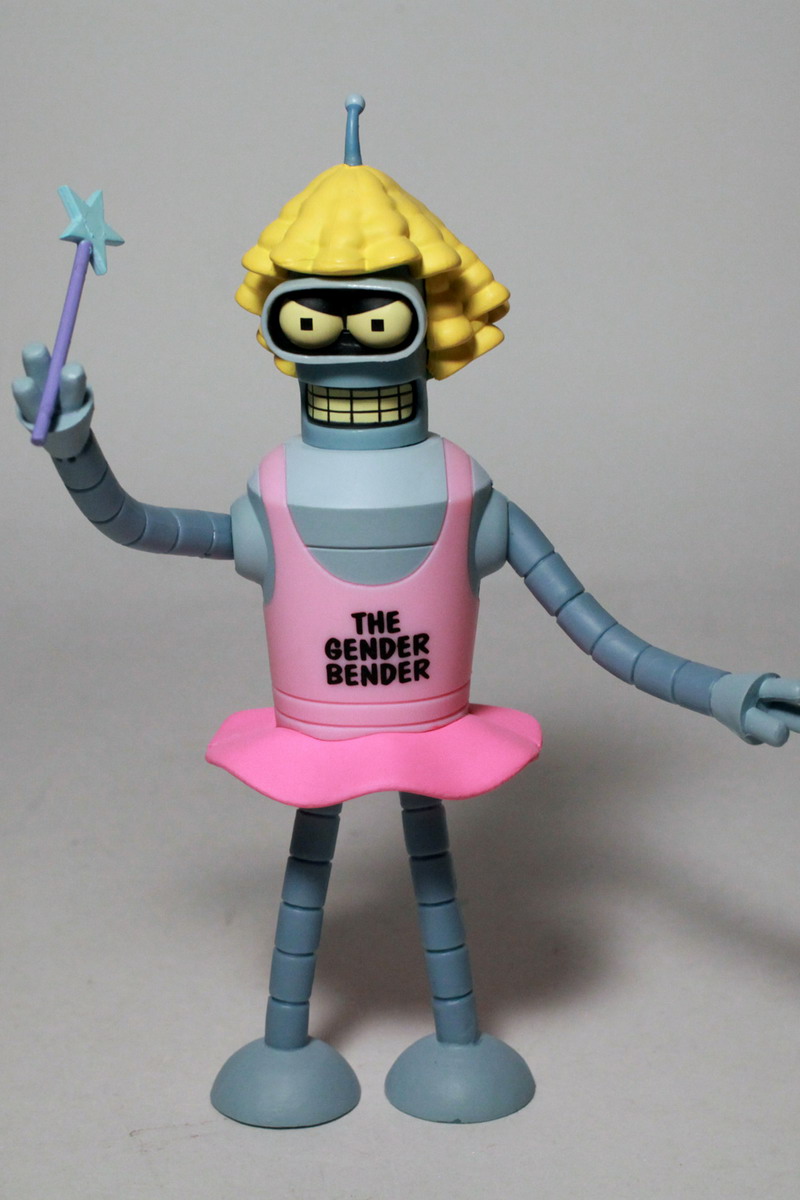 The Gender Bender uses the same basic Bender mold with a few add-ons, such as a blonde wig of hair and the pink tutu that says “The Gender Bender” on the front. The same points of articulation as the previous Bender apply here with neck, bendy arms and bendy legs. No longer a feature is the opening stomach compartment to store things.