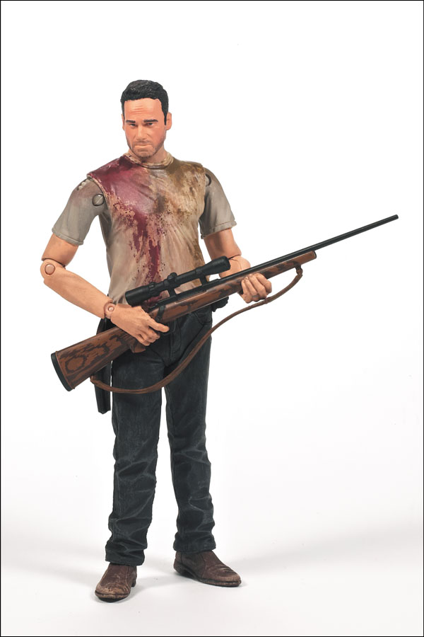 In addition to McFarlane's Walking Dead TV Series 4 releasing this October, fans will want to take a trip to their local pharmacy to grab a new figure exclusive. Exclusive to Walgreens, Hastings and Grosnor Distribution, this version of Rick Grimes in his Season 3 Prison attire. Figure includes 14 points of articulation, interchangeable hands, removable revolver, rifle with strap, and an animal control stick (for walker catching).