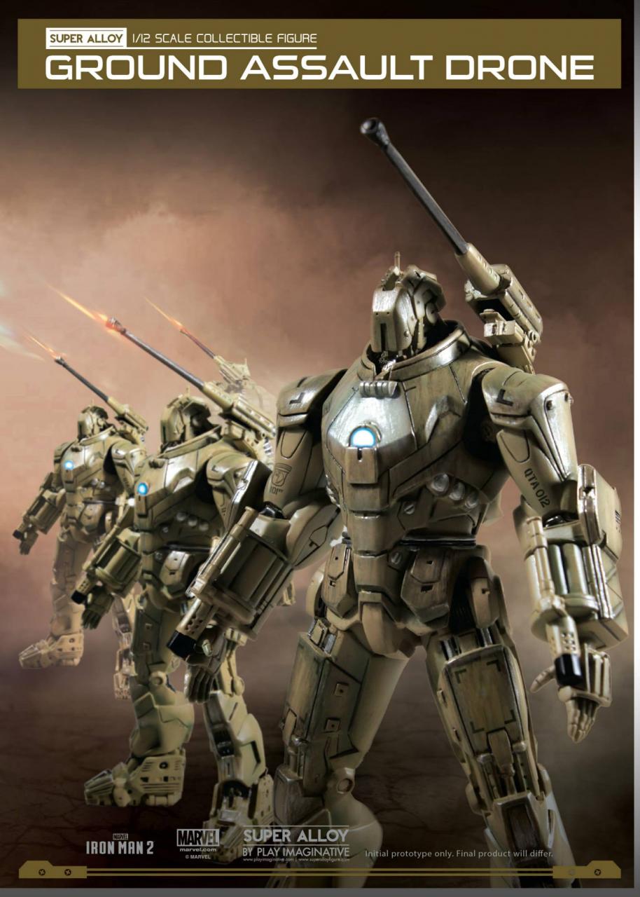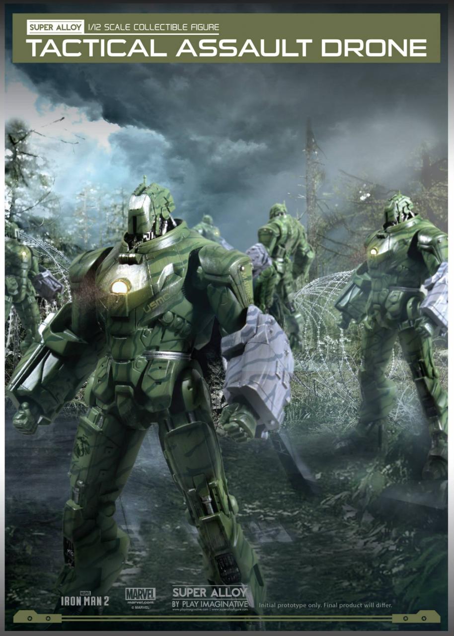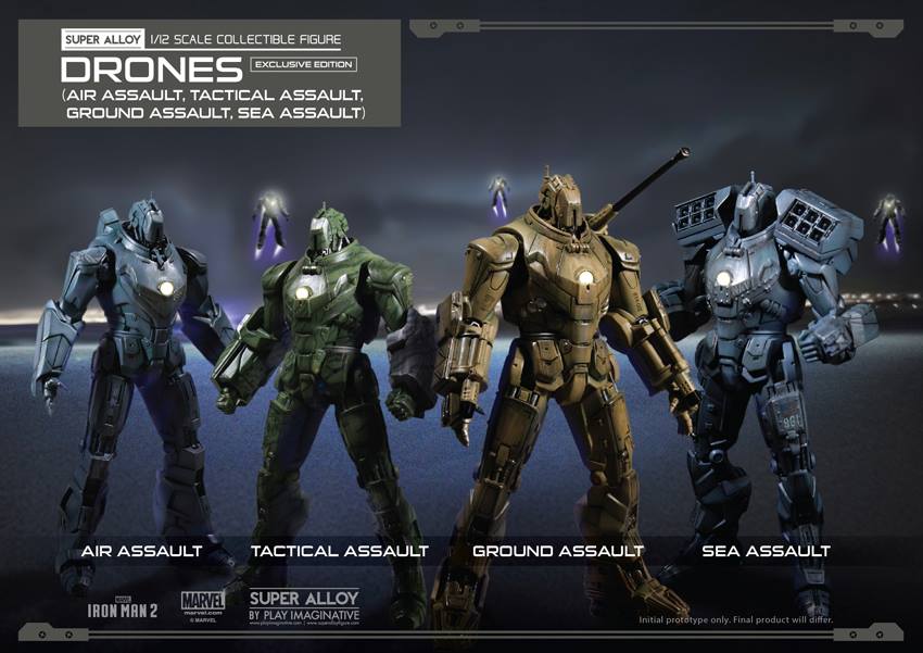 While details are sparse so far, Play Imaginative has revealed on its Facebook page that their Marvel Super Alloy 1/12 scale lineup will be adding "Exclusive Edition" Iron Man 2 Drones! Shown in some cool photoshop images are the Air Assault Drone, Tactical Assault Drone, Ground Assault Drone, and Sea Assault Drone. Scroll down for all of the images, and keep it here on Figures.com for more information as it becomes available.
