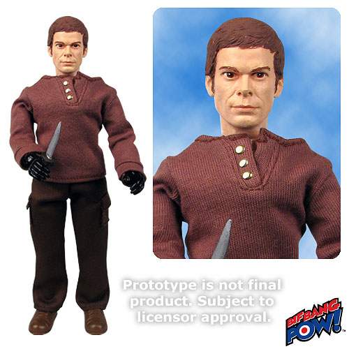 BifBangPow! just released details on an upcoming figure of everyone's favorite serial character, Dexter Morgan from the Showtime series Dexter! Coming to BBP's signature 1970s style 8 inch action figure lineup, the forensic scientist is dressed to kill in his "murder outfit" with fabric clothing and a knife accessory. Dexter will be fully articulated and come packaged in the familiar blister. Look for him to arrive in the summer next year.