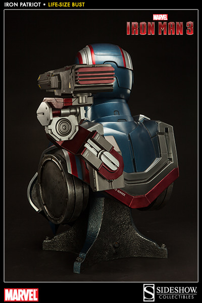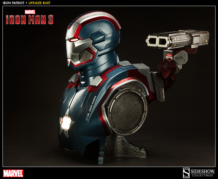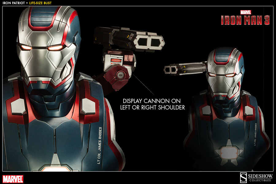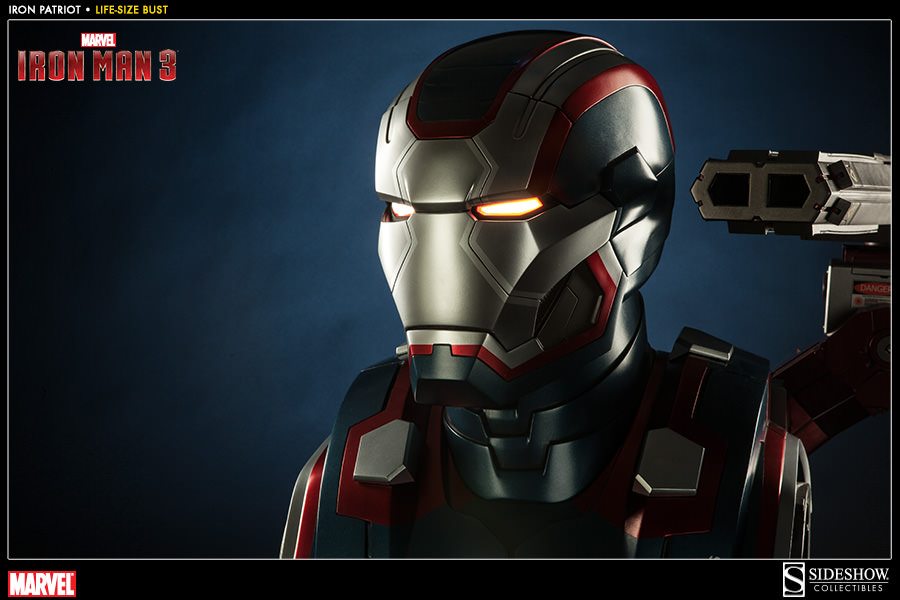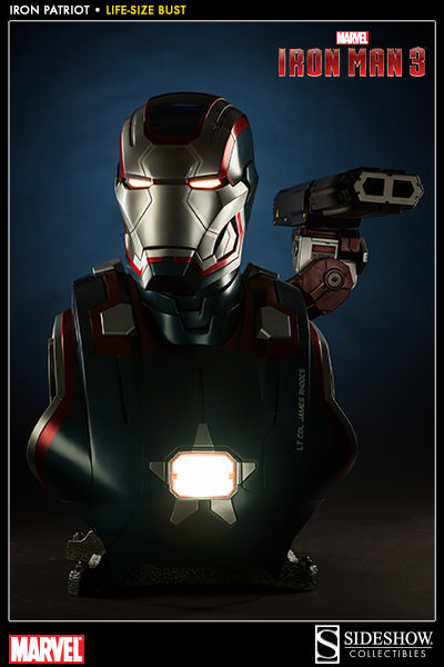 Sideshow is now accepting pre-orders on their latest Iron Man 3 collectible: a 1:1 scale, life-size bust of the Iron Patriot. This large as life piece is priced at $999.99 with a Payment Plan available for as little as $112.50/month. The massive Iron Patriot Life-Size bust measures over two feet tall featuring an imposing shoulder-mounted cannon and brilliant white LED’s to light his glowing eyes and arc reactor. Thsi limited edition sculpture is expected to ship in July 2014.