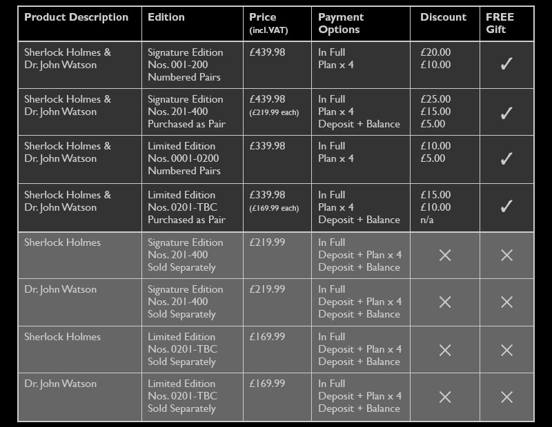 The numbered figures are available exclusively from bigchiefstudios.co.uk and will be offered in both Signature and Limited Editions. For the first time BIG Chief announces that these figures will also be available in ultra-limited numbered pairs. Buy both Sherlock and Watson as a pair and receive a limited time discount off the total price, plus an exclusive FREE gift. Signature Edition figures are strictly one of each character per customer as BIG Chief anticipates high demand.