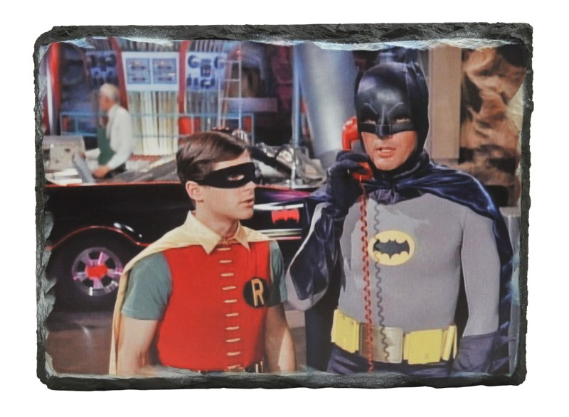 When does a picture carry the most weight? When it's set in stone! You don't need to be the World's Greatest Detective to realize that this Granix slate artwork of the Dynamic Duo in their Batcave is the grooviest way to display your love of the Batman Classic TV Series. With a beveled edge that resembles the craggy caverns of the Batcave, this slate artwork measures 7.5" by 5.5", and includes mountings for desk and wall display. (Item #DEC131819, SRP: $34.99