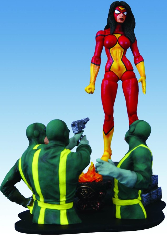 Now endowed with super-strength, a bio-electric attack, and wall-crawling abilities, Spider-Woman's destiny led her to join the New Avengers. Standing 7" tall, the Marvel Select Spider-Woman figure features a highly-detailed base, plus three partial figures of Hydra agents to create an action scene! Packaged in the Select line's trademark display packaging, with spine artwork. Sculpted by Sam Greenwell. (Item #DEC052708, SRP: $24.99)