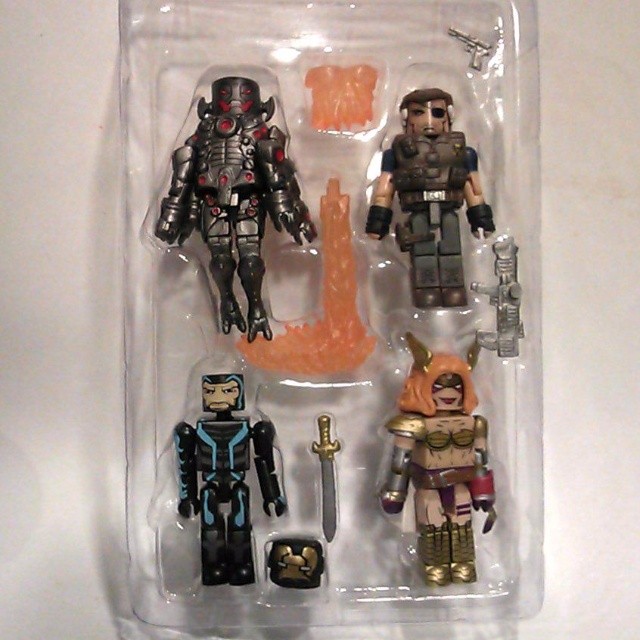 Tomorrow (12-4), the newest set of Marvel Minimates hits comic shops and specialty stores, and it’s come all the way form the Age of Ultron. Depicting the tyrannical robot Ultron as he appeared on the covers of the Age of Ultron maxi-series, this set of 2-inch Mini-figures also comes packaged with A.O.U. versions of Iron Man and Nick Fury, as well as the first-ever Minimate of Neil Gaiman’s supernatural comic character Angela. Angela comes with a sword, Iron Man has a removable helmet ad boot jets, Nick Fury has a rifle and jet pack, and Ultron sports six fully poseable arms.
