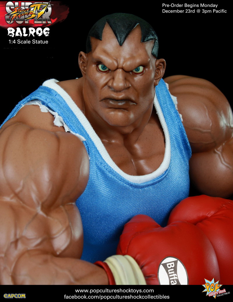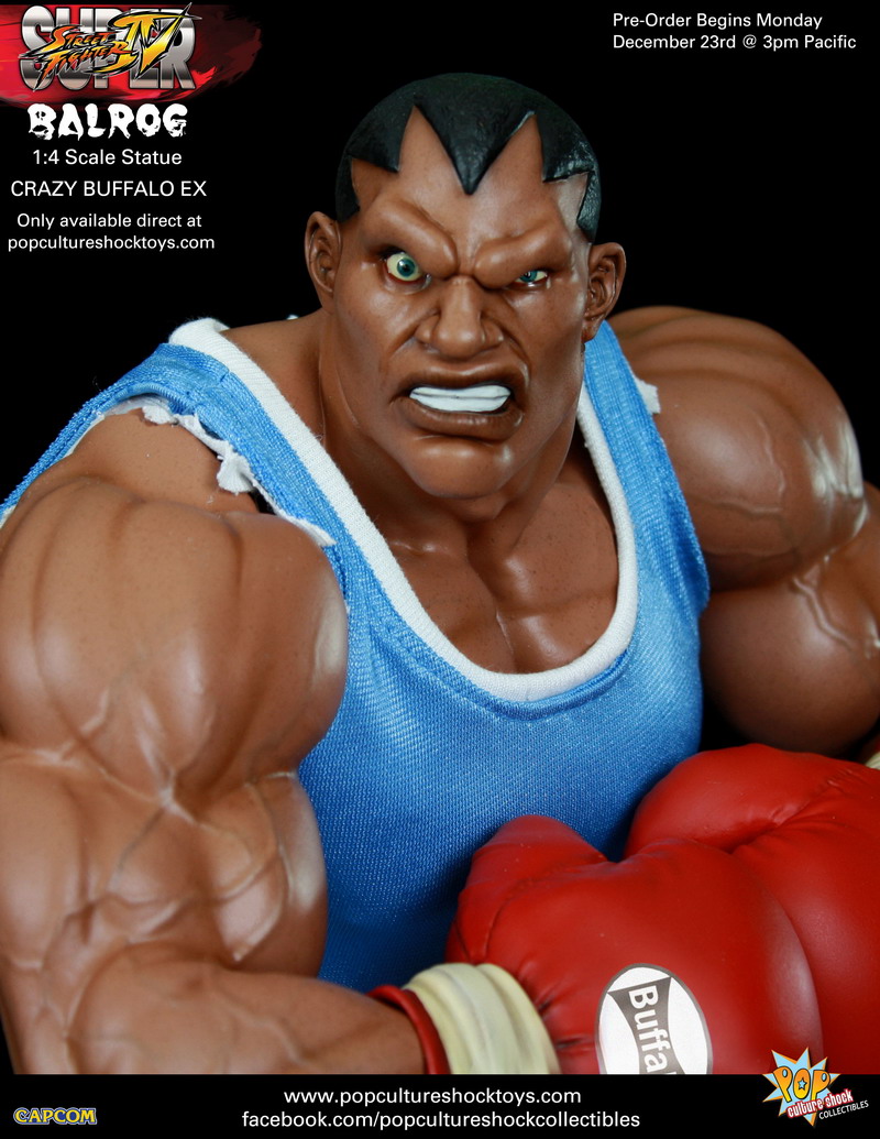 Pop Culture shock presents the last of the original Street Fighter II bosses - BALROG - as their newest 1/4th scale mixed media statue. Standing roughly 17” tall, the hot tempered pugilist will be available as two versions: Standard Edition ($340) with one mnouth closed head sculpt (pictured above) and a PCSC "Crazy Buffalo" Exclusive Edition ($345) which includes two head portraits: mouyth closed and with bared teeth and one eye buggin' out (pictured below).
