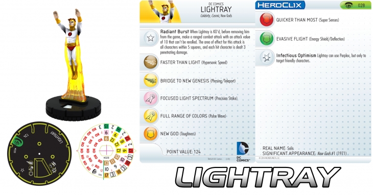 Are you ready to catch up on all the crazy HeroClix news from this week? Well, strap in tight because there's a lot! First up, today's DC Comics Superman and the Legion of Super-Heroes preview added another New God to the mix with Lightray! Another fan favorite character never before clixed, this 'Ray blasts off with a great flying pose on top of a translucent yellow energy trail. At 124 points he has Flight, a 7 range with two targets, and a trait that lets him set off a massive attack when he's KO'd! Lightray's dial is pretty straightforward with starting Hypersonic Speed, Toughness, and Perplex for allies only before switching mid-dial to Precision Strike briefly and Phasing/Teleport, Pulse Wave, and Super Senses. End-dial he gets some Energy Shield/Deflection and on his last click gets a boost in effectiveness with the return of HSS and Precision Strike. Naturally he has the Celebrity, Cosmic, and New Gods keywords, and expect to see him on theme teams of the latter. Lightray is an uncommon in the "SLOSH" set which you can preorder at Miniature Market.