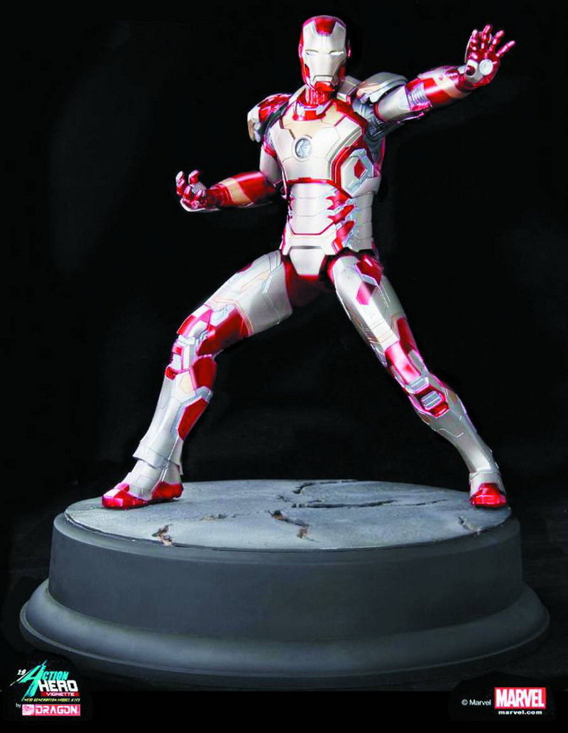 Also available is the Iron Man 3 MK. 42 Action Hero Vignettes (Item Code: JAN142119, SRP: $149.99). Iron Man MK. 42 represents the third Iron Man movie, featuring the newest more sleek and technologically advanced suit. The MK.42 Iron Man poses in battle stance with his arm repulsor aimed to fire.
