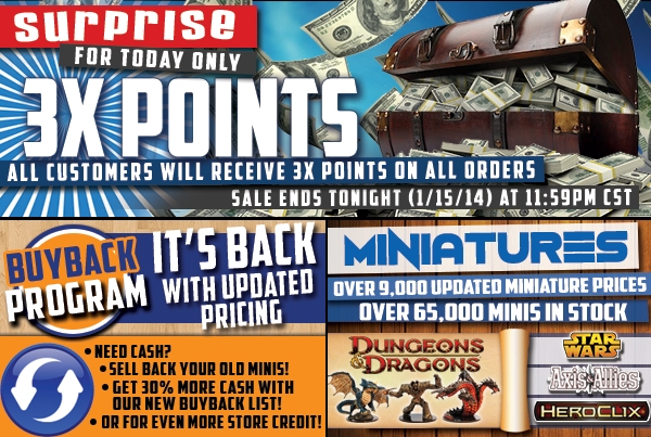 Miniature Market has a trifecta of great news for players today starting with a surprise 3x Points Day! For today only until 11:59pm CST you'll get triple the points on all purchases you make through the site, so if you were holding out now is the time to pick up some great stuff. In addition, the Buy Back Program has been enhanced with updated pricing, and they've lowered prices on thousands of in stock miniatures! Head to Miniature Market now to take advantage of these great deals and programs and tell 'em Figures.com sent you.