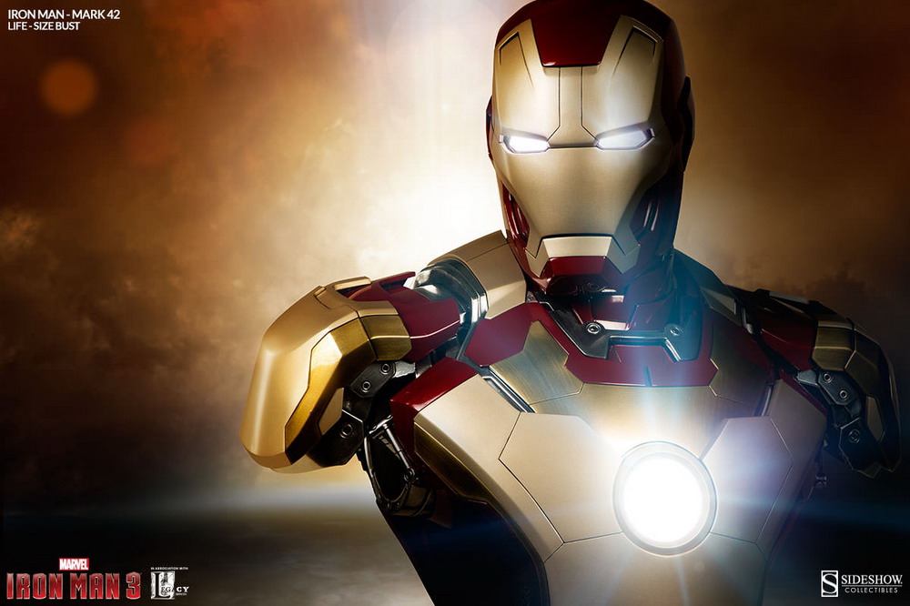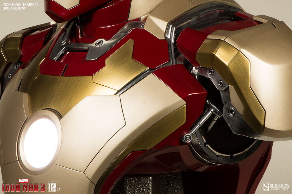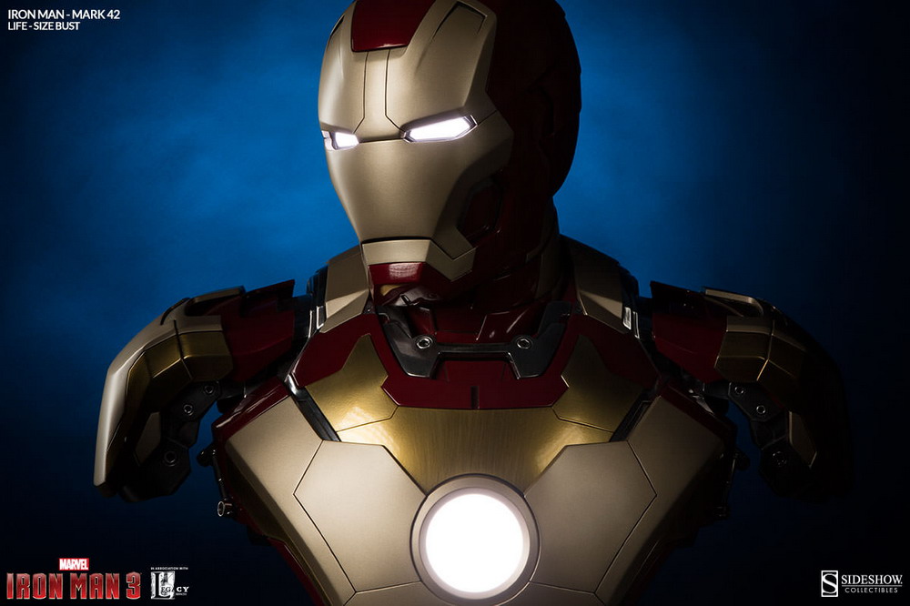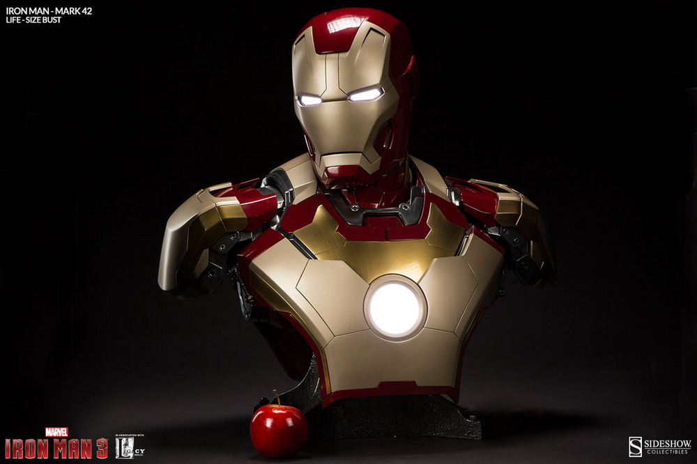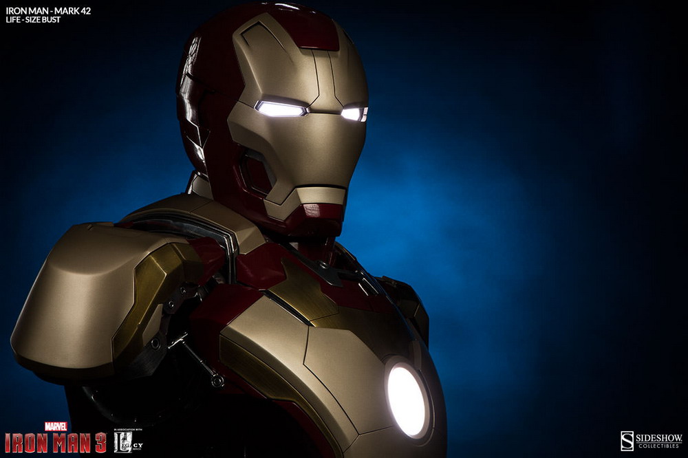 Sideshow is now accepting pre-orders on their latest life-size Iron Man bust: Iron Man Mark 42. Measuring just over two feet tall, Stark’s latest "bouncing badass" armor is brought to life with a stunning high gloss paint application, and brilliant white LEDs to light his eyes and arc reactor.