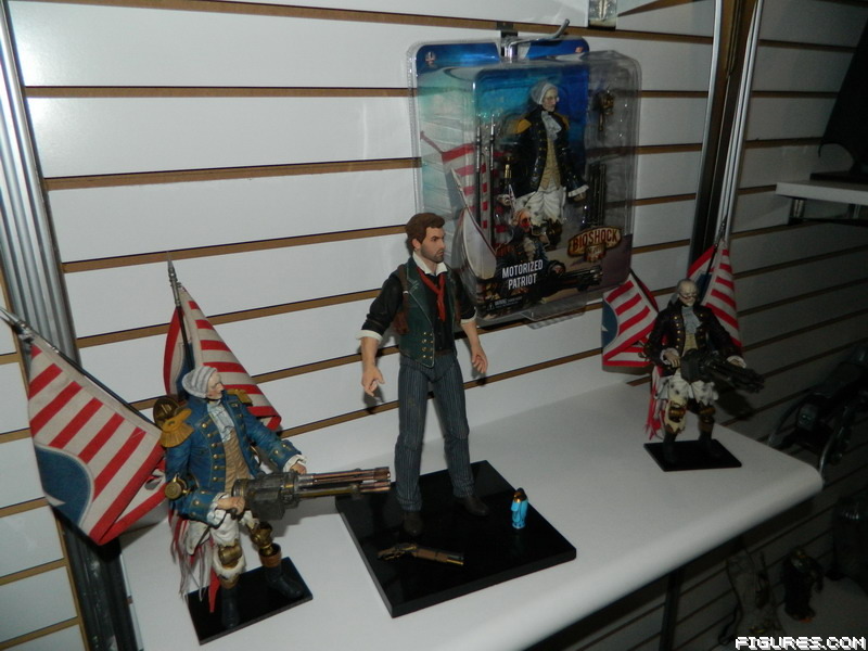 Based on the hit sequel Bioshock Infinite is NECA's line of unique collectibles that offers cool stuff like figures and replica items. At Toy Fair they showed off some of the new things they're working on, like the recently announced Motorized Patriot variant of "Heavy Hitter" Bejamin Franklin (coming in May)! It's a great companion to the previously released Washington with a new creepy face with spectacles and a purple jacket. If you like these figures then rush out and get Franklin, because NECA has at least two more potential Patriots ready to go. Meanwhile, the big reveal was a 2-up prototype of Booker DeWitt, protagonist of the game! The hero looks like he stepped right out of Columbia with his dapper clothing and intense look of concentration. Booker will come with his pistol, shotgun, and Vigor.