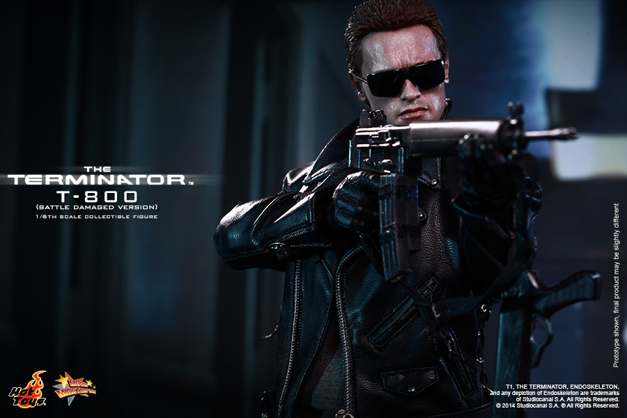 The T-800 collectible is specially crafted based on the image of Arnold Schwarzenegger in battle damaged look from the movie featuring two battle damaged head sculpts with red LED light up left eyeball, leather-like jacket, as well as detailed weapons and a specially crafted diorama figure base.