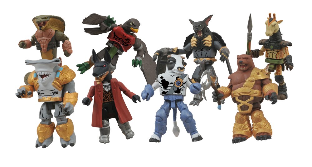 From the mind of Art Asylum and the pages of the IDW comic book comes an all-new series of Battle Beasts Minimates. This new assortment of two-inch warrior animals includes eight new beasts only available on the specialty market: Giraffe & Hammerhead, Cow & Bear, Cobra & Bat and Anubis & Thrush! Each Minimate stands 2 inches tall with 14 points of articulation and features a variety of removable and interchangeable parts and accessories. Create your own animal combinations. (Item #MAR141957, SRP: $9.99 Ea.)