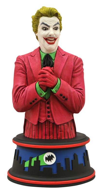 DST continues their line of busts based on the Batman Classic TV Show, and this one is no joke! Hot on the heels of Batman, it's The Joker, as played by Cesar Romero, with his painted-over mustache and all! This bust measures approximately 6 inches tall, and is a must-have for any Classic Batman TV Show fan. Designed by Barry Bradfield! Sculpted by Jean St. Jean. (Item #MAR141944, SRP: $59.99)