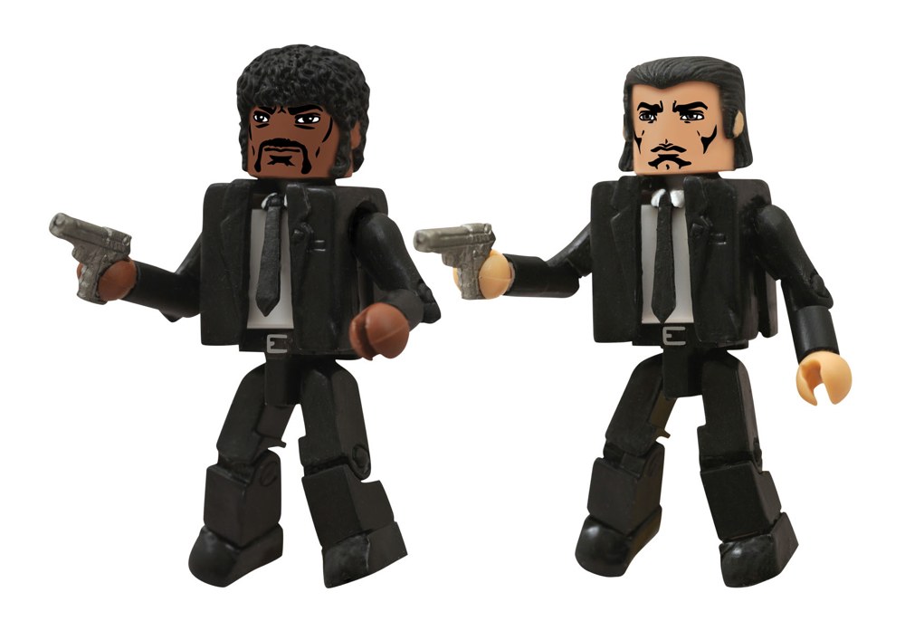 The first Minimates based on Pulp Fiction, the star-studded movie that made Quentin Tarantino a household name, are here, and the first two-pack features hitmen Vincent Vega and Jules Winnfield in their iconic black suits! Each two-inch mini-figure has 14 points of articulation and features a variety of interchangeable parts and accessories, including pistols, hamburger, shake and the mysterious briefcase.(Item #MAR141945, SRP: $9.99Ea.)